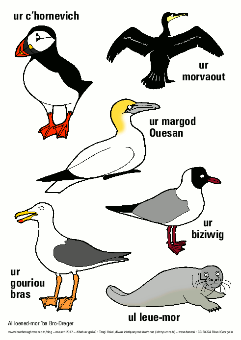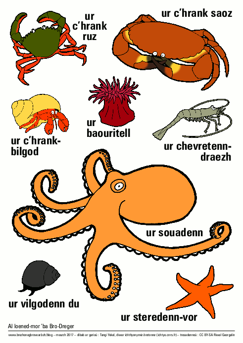 Bégard se trouvant relativement loin de la côte, notre collecte est assez pauvre pour tout ce qui a trait au vocabulaire marin. Nous avons donc tiré profit du site Ichtyonymie bretonne (avec l’aimable autorisation de ses auteurs) pour réaliser un tableau qui présente plus de 200 noms d’animaux marins employés dans les communes des côtes du Trégor, ainsi que deux affiches avec les animaux marins les plus fréquents.